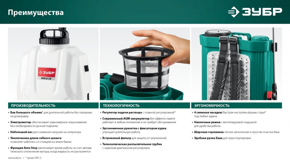 - Большой бак для жидкости объемом 16 л обеспечивает длительную работу без дозаправки