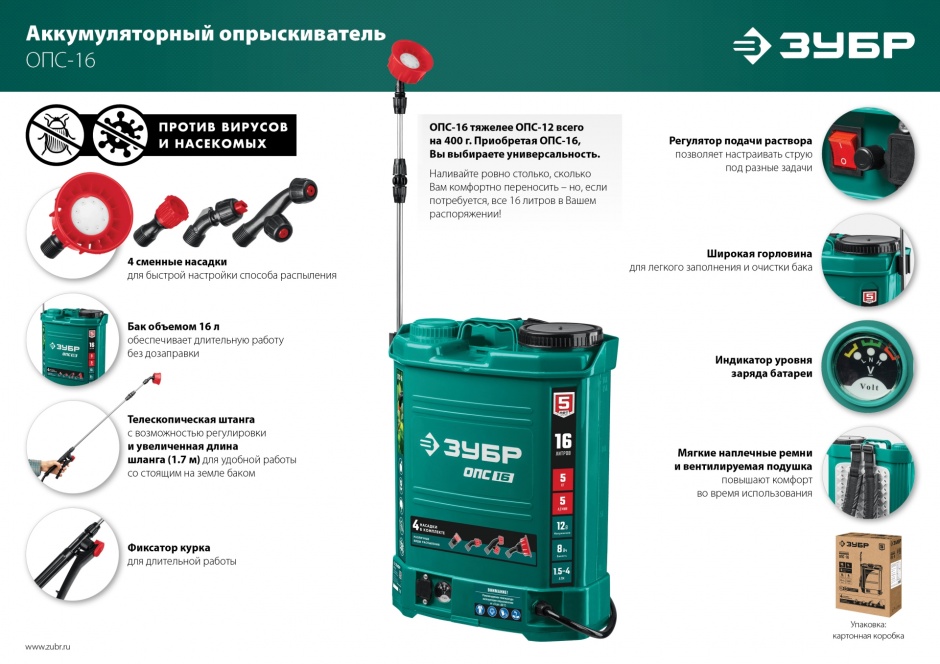 Ранцевый аккумуляторный опрыскиватель отличается эффективностью, мобильностью, экологичностью. Бережно орошает растения. Подходит для дезинфекции помещений и участков, мытья окон и стен, нанесения антисептиков и антипиренов. Работает от свинцово-кислотного аккумулятора. За счет наличия ремней обеспечивается удобство переноски на спине.