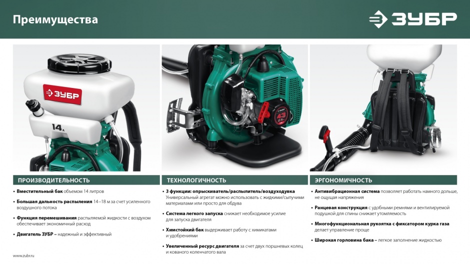 Бытовой опрыскиватель с радиусом распыления до 14 метров, подходит для использования в домашнем хозяйстве. Может применяться для внесения удобрений, полива и обработки различных культур от насекомых. Ранцевый опрыскиватель очень удобен в использовании, благодаря способу переноски и небольшому весу. Управление оборотами двигателя и подачей раствора осуществляется с помощью специальной рукоятки на корпусе.