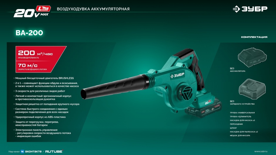 Легкая и компактная аккумуляторная воздуходувка-пылесос - универсальный инструмент, который поможет очистить территорию от листьев и мелкого мусора, убрать стружку и пыль в рабочей зоне, очистить мебель, компьютеры и бытовую технику от пыли, машину и придомовую территорию от снега, послужит в качестве насоса для надувных изделий. Надежный и экономичный Brushless мотор и турбо-режим помогают эффективной и быстрой работе.