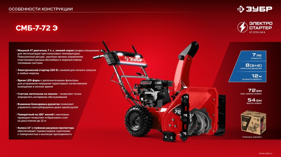 Универсальный и мощный снегоуборщик ЗУБР предназначен для эффективной очистки территории вокруг вашего дома. Оснащён зимним четырехтактным двигателем WINTER PRO, разработанным для надёжной работы в самых сложных зимних условиях.