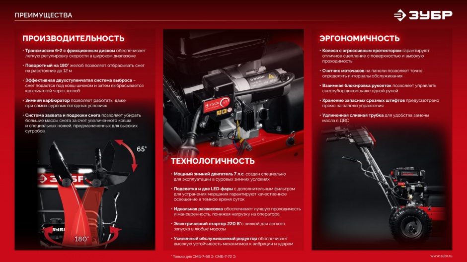 - Двухступенчатая система обеспечивает быструю очистку и увеличивает дальность выброса снега