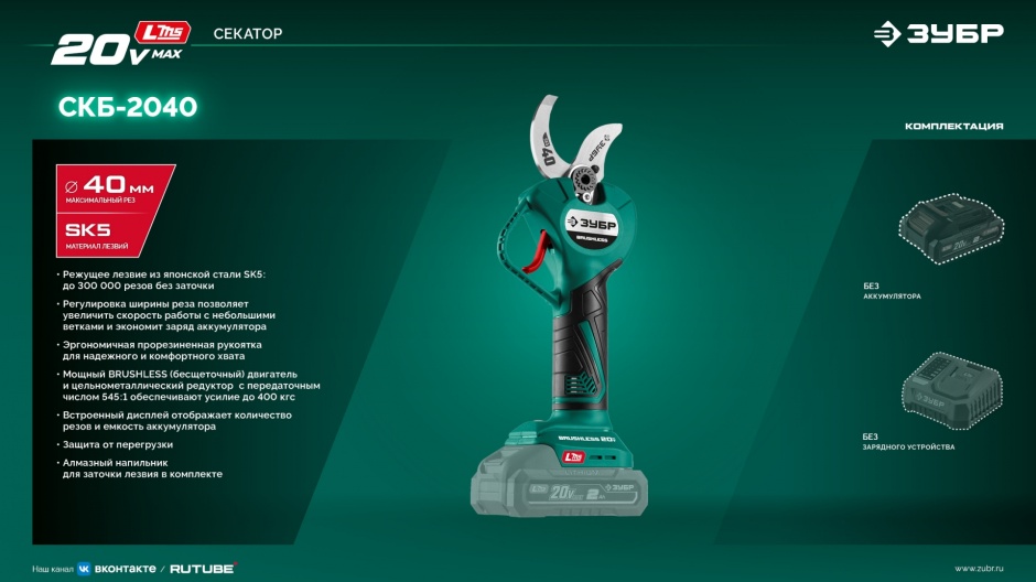 Аккумуляторный секатор ЗУБР - удобный инструмент для срезания веток кустарников и деревьев. Большая ширина захвата с возможностью настройки, мощный бесщеточный двигатель и сверхострое режущее лезвие из сплава SK5, позволяют производить ровный срез не прилагая излишних усилий.