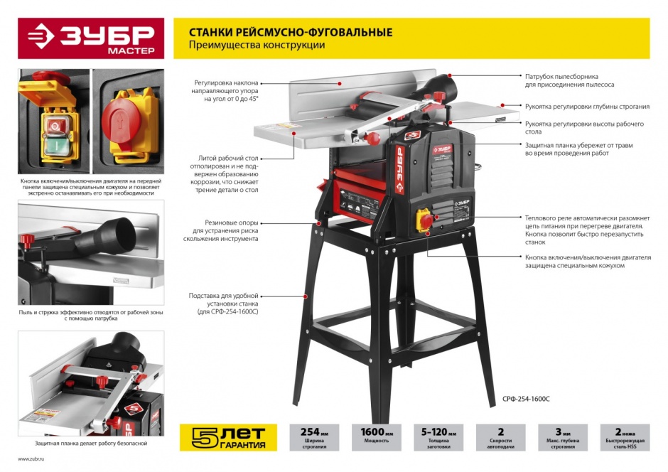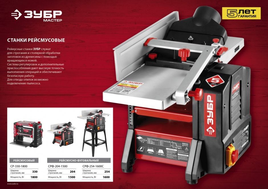 Комбинированный станок, сочетающий в себе функции рейсмуса и фуганка, способен обрабатывать заготовки из древесины толщиной до 120 мм и шириной до 254 мм. Простой в эксплуатации и не требующий специального обслуживания, станок ЗУБР значительно расширяет функционал любой мастерской по дереву.