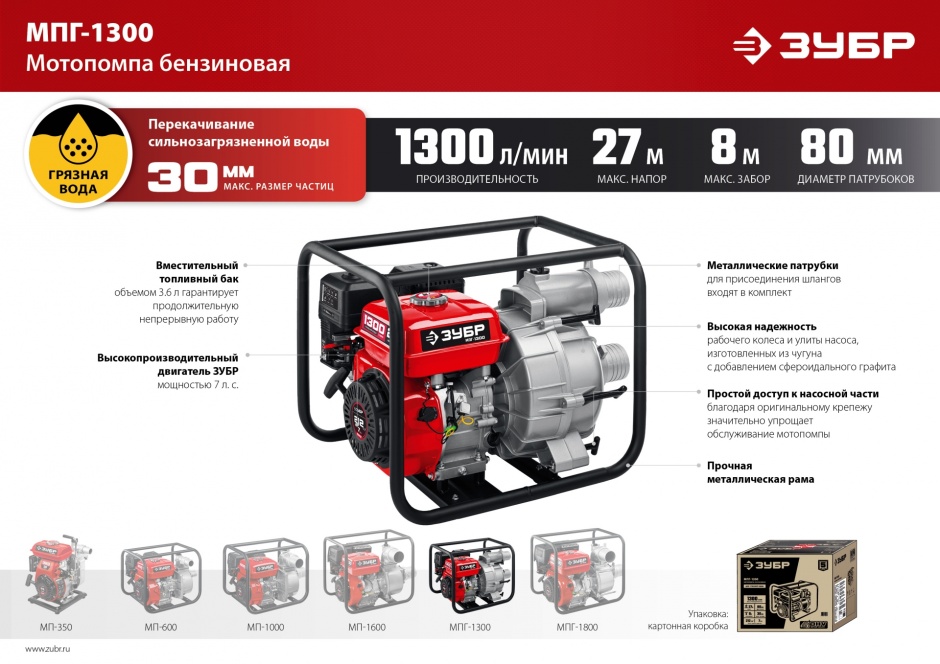 - Простой доступ к насосной части благодаря оригинальному крепежу значительно упрощает обслуживание мотопомпы