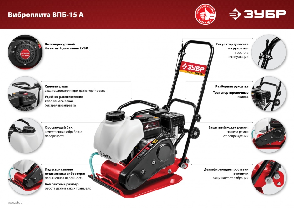 Виброплита предназначена для уплотнения бетонных, асфальтовых и сыпучих материалов, а также для формирования уплотненных поверхностей. Компактная конструкция позволяет осуществлять уплотнение смешанного грунта в самых узких местах, даже в очень узких траншеях. Направляющая рукоятка с виброзащитой позволяет увеличить количество часов непрерывной работы и снизить усталость для оператора. Четырехтактный двигатель ″ЗУБР″ обеспечит беспроблемную эксплуатацию при минимальном сервисном обслуживании на весь срок использования.