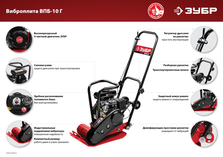 Виброплита предназначена для уплотнения бетонных, асфальтовых и сыпучих материалов, а также для формирования уплотненных поверхностей. Компактная конструкция позволяет осуществлять уплотнение смешанного грунта в самых узких местах, даже в очень узких траншеях. Направляющая рукоятка с виброзащитой позволяет увеличить количество часов непрерывной работы и снизить усталость для оператора. Четырехтактный двигатель ″ЗУБР″ обеспечит беспроблемную эксплуатацию при минимальном сервисном обслуживании на весь срок использования.
