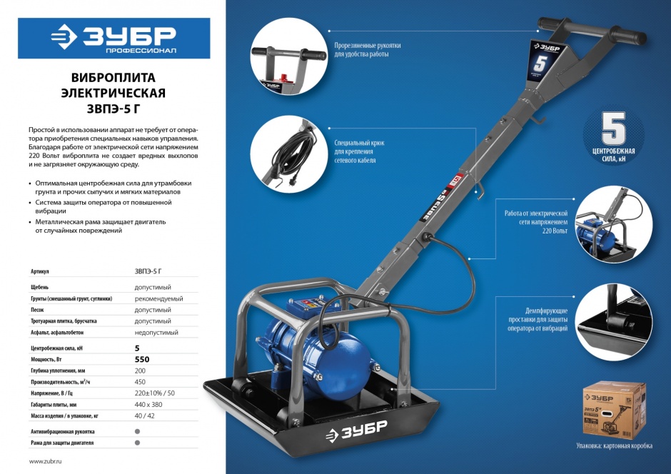 Электрическая виброплита ЗУБР проста в использовании и не требует от оператора приобретения специальных навыков для управления. Машина работает от электрической сети напряжением 220 В, поэтому не производит вредных выхлопов.